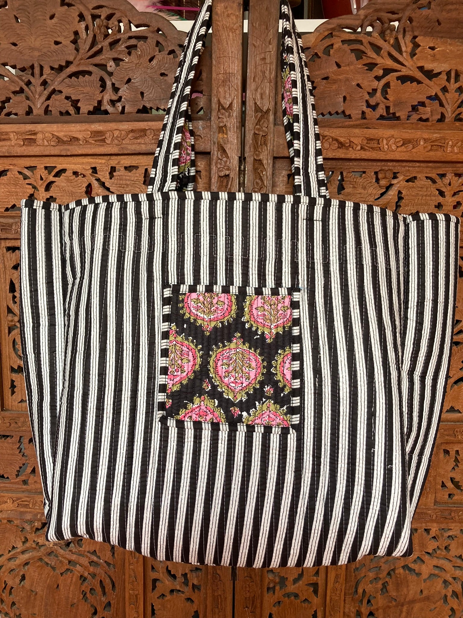 This bag is handmade from 100% cotton block print fabric with quilted padding to give the bag shape and add protection to the contents. Bag is reversable with striped cotton lining and pocket on the inside. Perfect bag for all occasions.