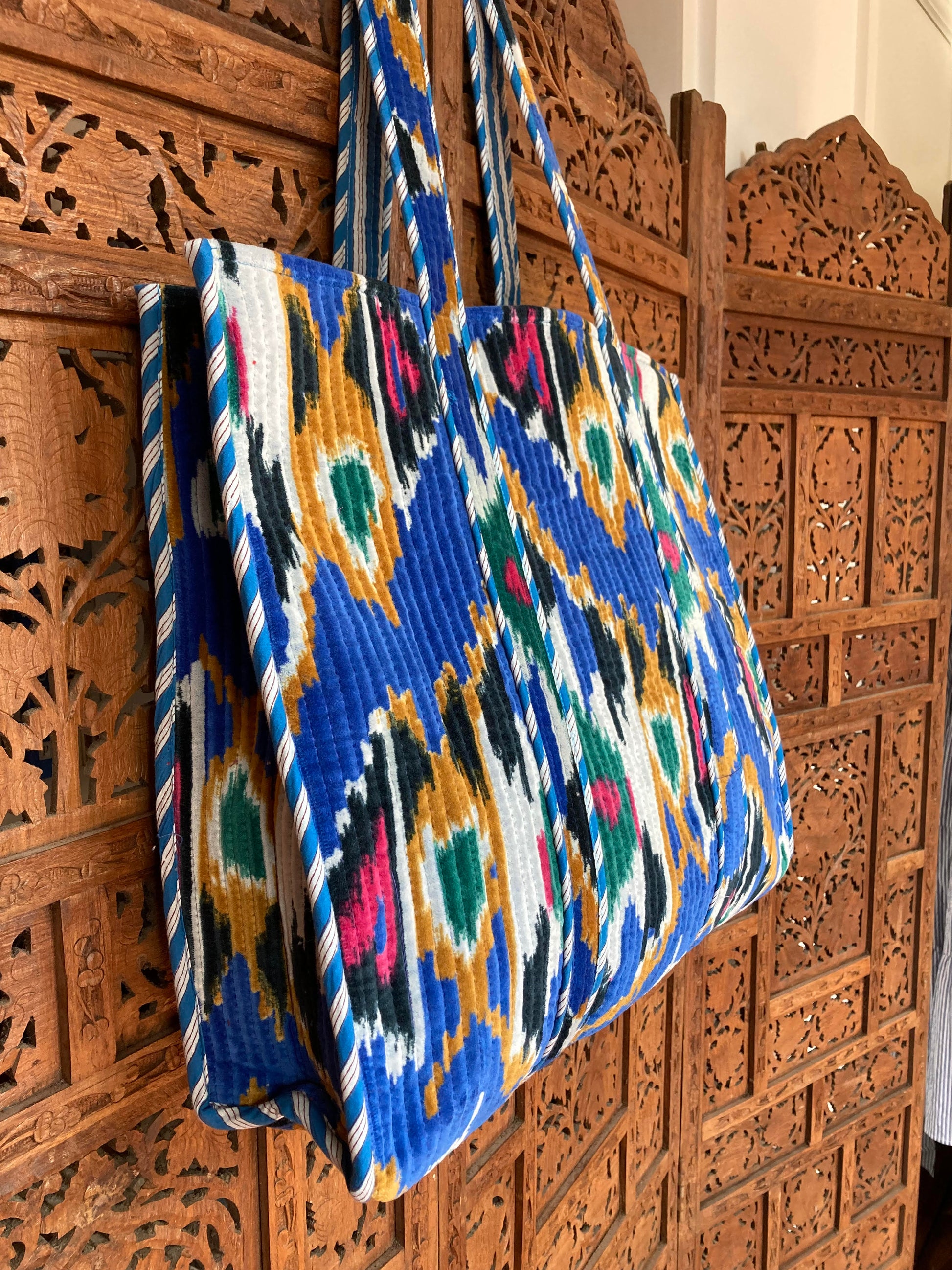 This bag is handmade from 100% cotton velvet ikat print fabric with quilted padding to give the bag shape and add protection to the contents. Bag is reversable with striped cotton lining and pocket on the inside. Perfect bag for all occasions and fits loads!.