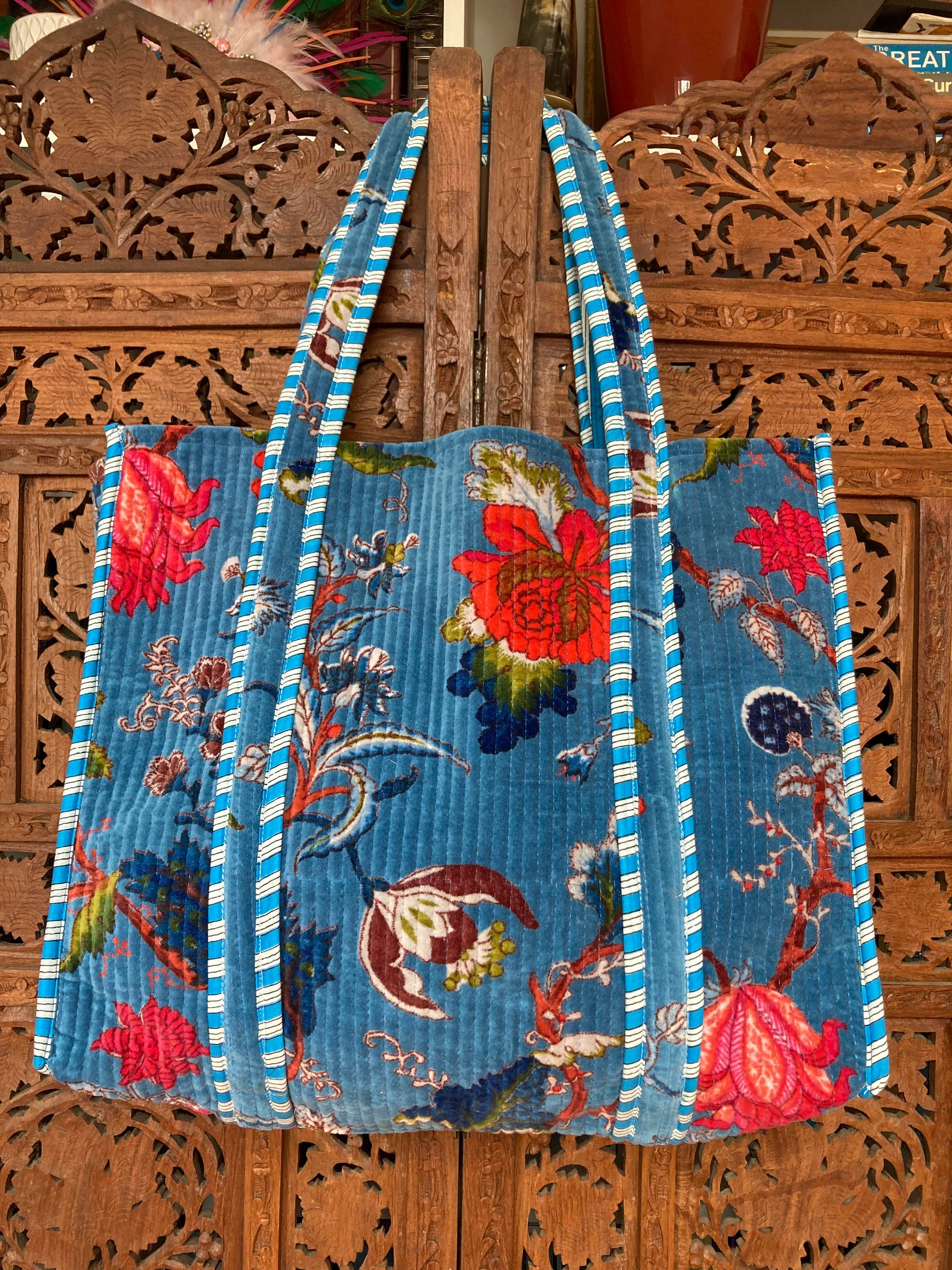 This bag is handmade from 100% cotton velvet block print fabric with quilted padding to give the bag shape and add protection to the contents. Bag is reversable with striped cotton lining and pocket on the inside. Perfect bag for all occasions and fits loads!