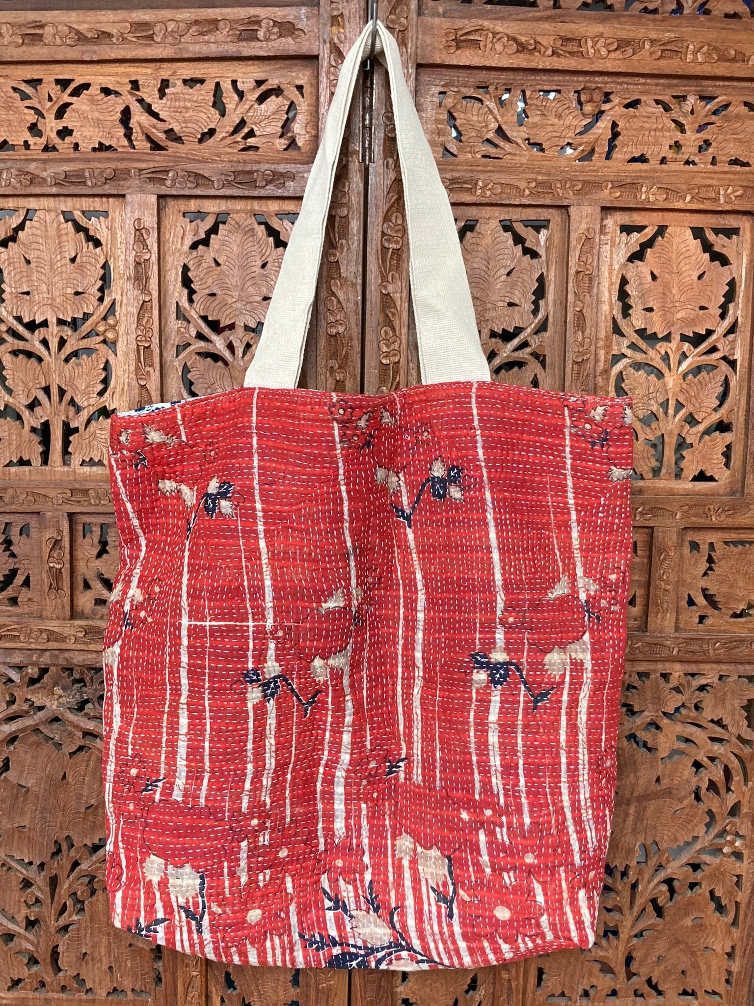 This bag is handmade using a vintage hand stitched kantha quilt. The bag is lined with 100% cotton blockprint fabric, has an open pocket and metalic clasp to keep it closed. Canvas straps add comfort and sophistication. Perfect bag for everyday and fits loads.